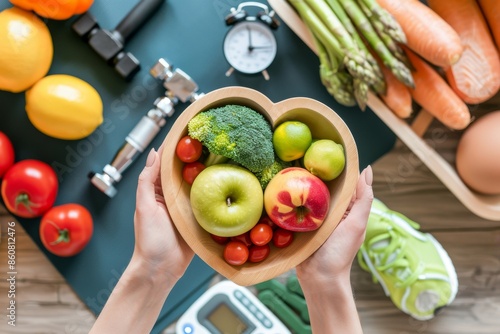 Concept for a healthy living lifestyle, including eating clean food, exercising and working out in a gym, and working out in sports shoes in a fitness center equipped with aerobic exercise equipment,