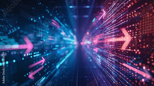 Background close up photorealistic Arrows and Flow Lines Connecting network , glow colors, neon color, long exposure, banner 16:9