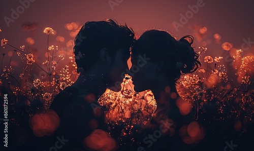 True love, silhouette of a couple among petals, magic lights and hearts, the concept of true love