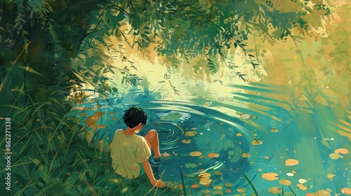 Young boy sitting on grassy bank at edge of small pond, lo-fi anime, childhood, nature, relaxation themes