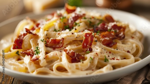 Close-up of creamy fettuccine Alfredo with crispy bacon pieces, garnished with herbs, served in a white bowl.