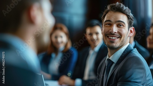 Business professionals in a meeting, smiling and engaged in discussion. Corporate teamwork and collaboration in a modern office setting.