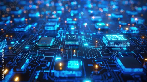 An intricate web of blue circuitry, illustrating the concept of technology and information networks.