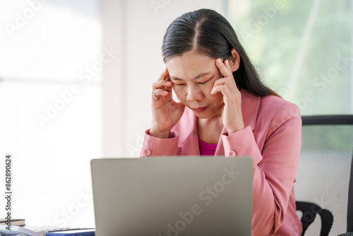40-year-old middle-aged Asian businesswoman wearing pink suit, business finance, investment strategies, risk management. Skilled in planning, analysis, operations control for business success.