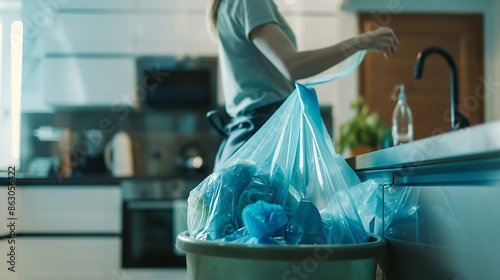 housewife changing a garbage bag in a bucket in the kitchen plastic garbage bag in the kitchen trash can in the kitchen garbage bag placed in a bucket : Generative AI