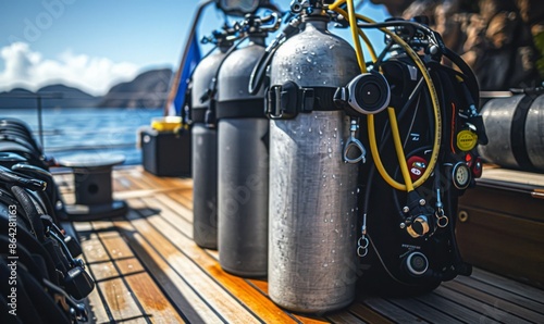 A scuba diving tank and gear on a boat deck ready for an underwater adventure