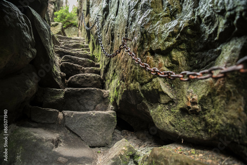 schody wykute w skałach z łańcuchem w formie poręczy na szlaku turystycznym w górach