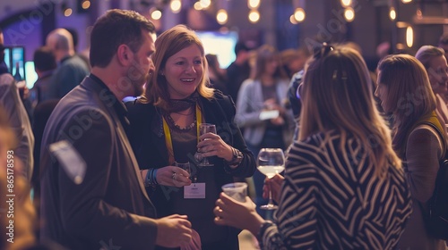 Networking business professionals at evening event, engaging in conversations and sharing drinks