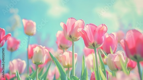 Pastel Tulip Fields Under a Light Blue Sky - Serene Spring Landscape
