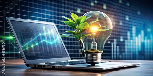 A futuristic laptop with a growing plant and lightbulb on screen, surrounded by graph papers and SEO keywords, symbolizing digital growth and online success.
