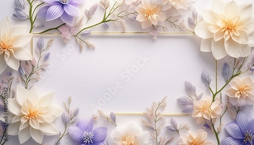 Subtelne tło z białą ramką otoczoną delikatnymi, pastelowymi kwiatami. Romantyczne tło ślubne, wiosenne