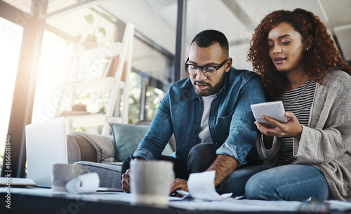 Accounting, budget documents or couple writing financial checklist, paperwork or planning savings. Calculator, investment or people organizing bills for paying debt, finance or household expenses