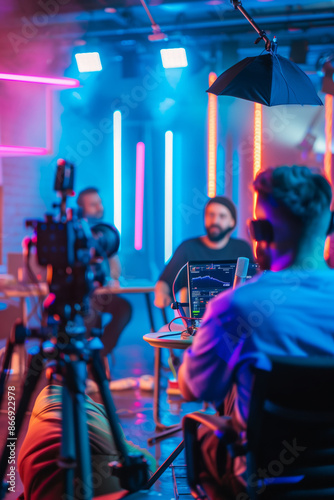 Male Influencers Recording a Podcast Chat in a Colorful Studio