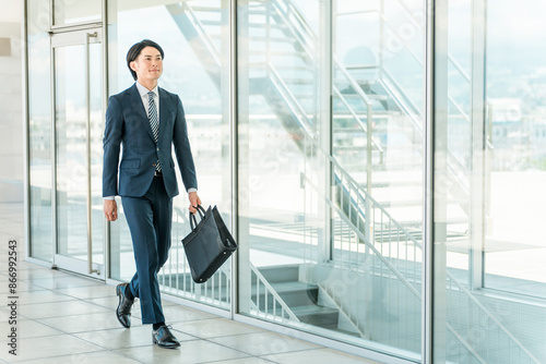 会社・オフィスに出勤・出社訪問営業・新規開拓・飛び込み営業に来た通勤する若い男性アジア人ビジネスマン