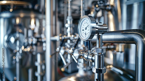 A temperature sensor attached to a stainless steel pipe in a brewery