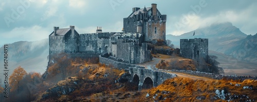 A majestic castle perched on a hilltop, its stone walls weathered by time and its history etched in its stones.