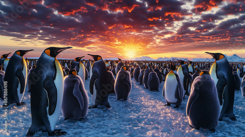 hundreds of king penguins on iceberg, sunrise or sunset, dawn or dusk, fantastic wildlife in Antarctica