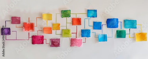 Colorful abstract flowchart on white wall, illustrating a diverse and vibrant workflow or connectivity concept in modern design.