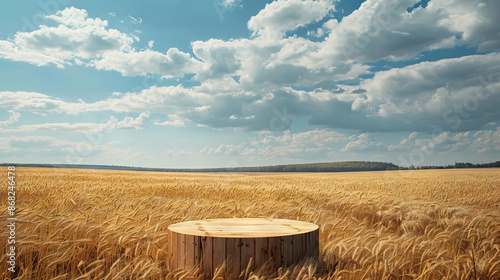 Empty wooden cylinder podium on big wheat field in summer time for product placement.