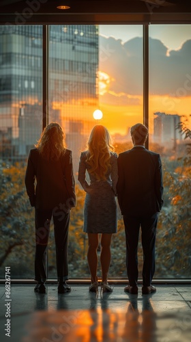 Different career professionals standing in an office environment, backs turned to the picture, gazing out through the windows.