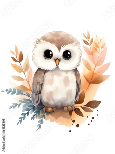 Cu Baby owl, digital illustration, nursery art style clipart on white background with pastel watercolor effect and cute leaves around the animal in the style of nursery art