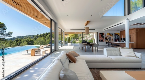 Maison dans le sud de la France avec de grandes fenêtres et une piscine, donnant sur des collines boisées. Vue intérieure du salon dans un style architectural moderne.