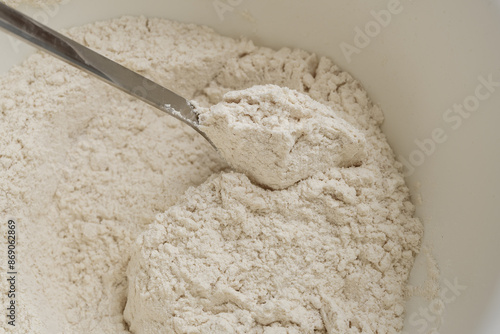 Sucha izolowana mąka w misce, mieszać łyżką suche składniki na ciasto