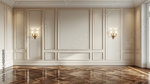 A wall with beautiful trim and sconce lighting, featuring classic parquet flooring. The background is a plain cream color for easy customization.