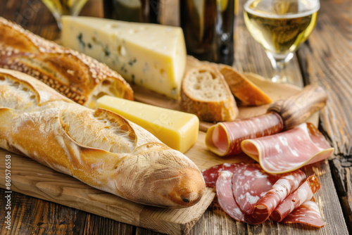 French baguette on the table with cheese, dried ham and a bottle of wine. AI generative.