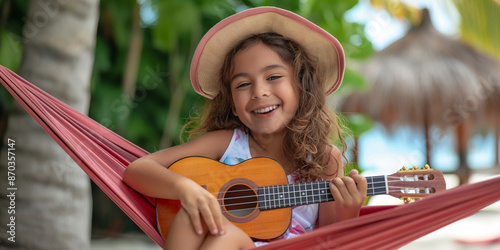 A young girl happily plays an acoustic guitar while sitting in a hammock outdoors.