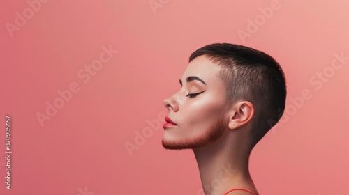 A woman with short hair and a red chin stands against a soft pink background