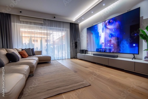Modern living room with a large TV on the wall and a comfortable leather sofa. The living room is furnished in a modern style with an emphasis on comfort and technology.