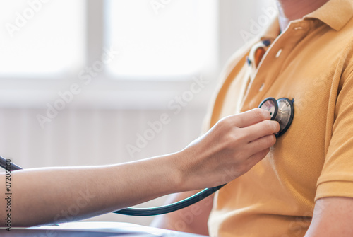 Doctors use stethoscope to listen patient heartbeat to find faults in heart disease. Doctors use stethoscope to listen patient heart rate to gather information diagnose disease and provide treatment.