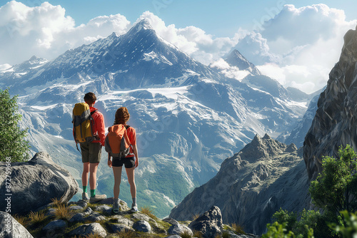 Para młodych ludzi - turystów na szczycie góry, podziwiających piękny górski pejzaż - szczyty gór w chmurach i malowniczą dolinę.