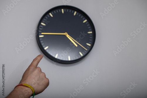 Pokazywać palcem na duży zegar wiszący na ścianie