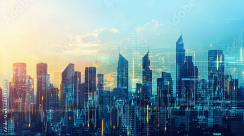 An elegant array of financial graphs merging into a skyline, symbolizing the growth and expansion of urban-based enterprises and markets.