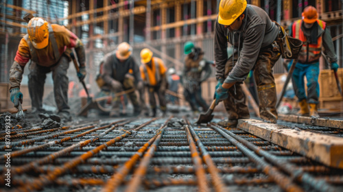 Construction workers in safety gear working on a rebar grid at a building site, highlighting teamwork and industrial themes.