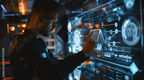 Man using a futuristic digital tablet while working on a project, highlighting advanced technology and digital tools in professional settings.