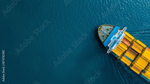 Aerial view of a busy seaport, cargo ships, containers, and trucks in perfect coordination, illustrating modern freight and transport logistics