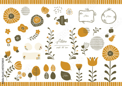 秋のお洒落で可愛い北欧風 手描きの花と植物のボタニカルでナチュラルなフレームとあしらい イラストセット