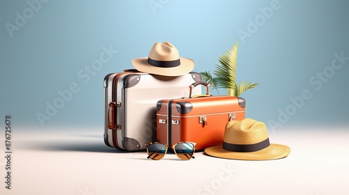 Travel concept with two suitcases, hats, sunglasses, and a palm leaf in tropical destination. Suitable for vacation, holiday, wanderlust themes.