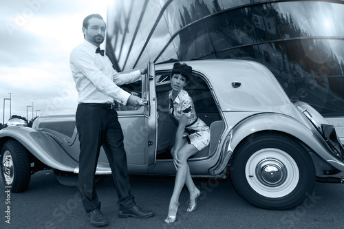 Model Paar mit Retro Auto Oldtimer schwarz weiß Porträt