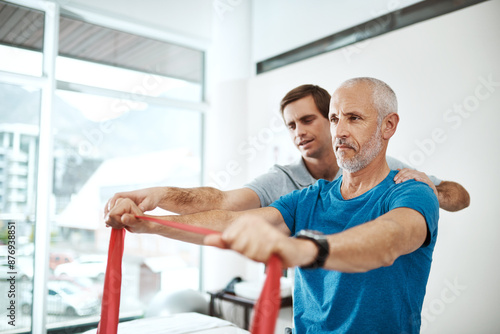 Fitness, physiotherapist and mature man with resistance band in clinic for physical therapy, support or mobility exercise. Health, male doctor and patient for help, stretching arms or rehabilitation