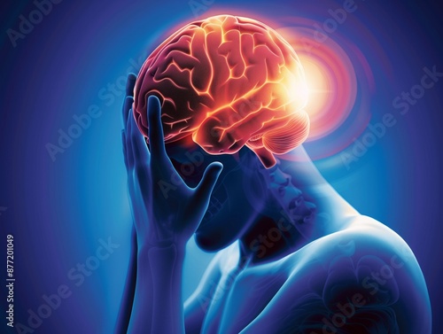 Conceptual illustration, glowing brain of a man holding his head in pain with his hands.