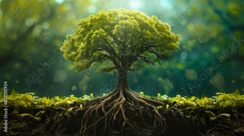 sustainable growth, a banner displays a tree with green leaves and roots reaching towards the sky, representing the growth of sustainable efforts