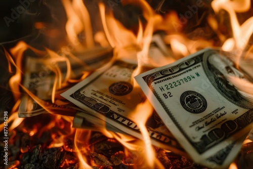 Stack of one hundred dollar banknotes is burning in bright orange flames