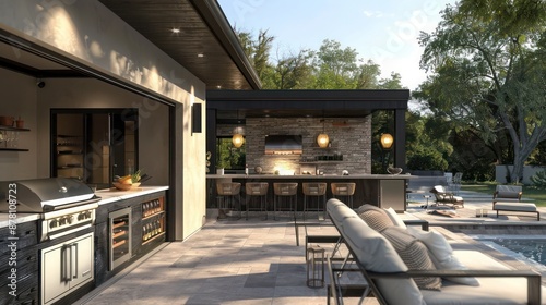 Contemporary suburban ranch with a fully equipped outdoor kitchen and bar, perfect for summer barbecues
