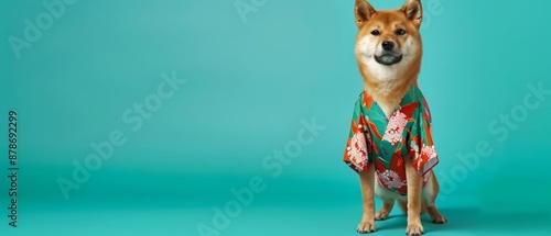 A Shiba Inu in a kimono stands serenely on a solid teal background, reflecting its Japanese heritage, with copy space