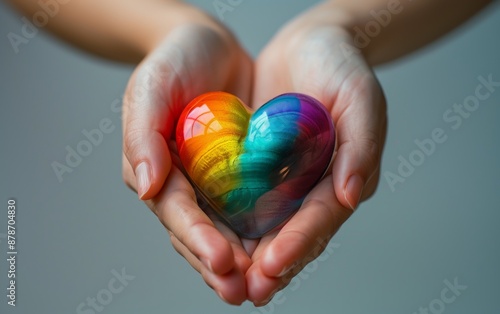 Hands holding a rainbow pride heart symbolizing love, inclusivity and compassion representing unity and diversity