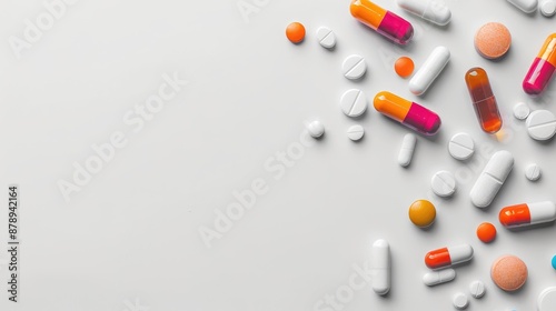 Various medications on white background with space for text